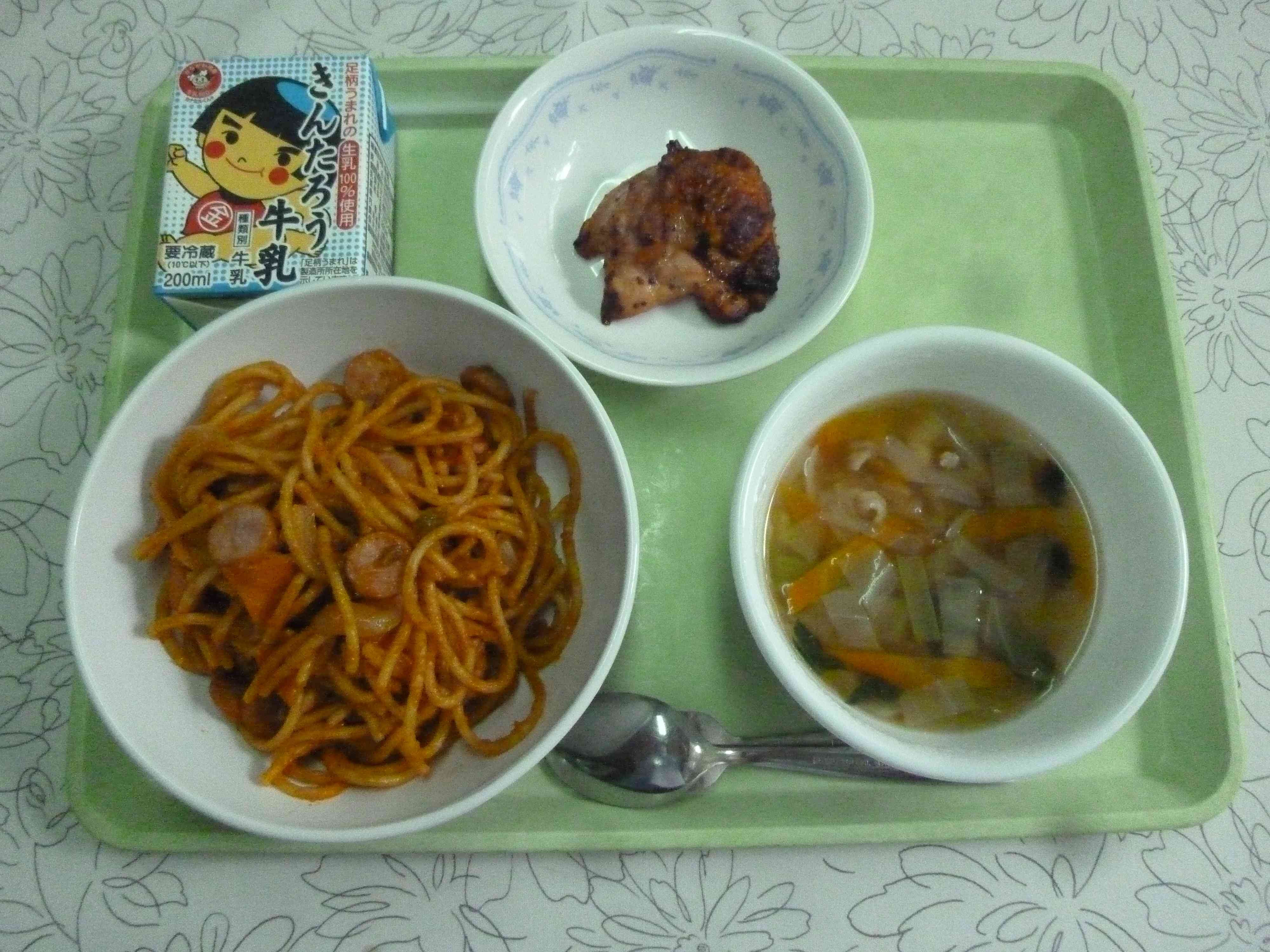 【メニュー】 スパゲティナポリタン 牛乳 野菜スープ ハニーマスタードチキン 【栄養教諭から】 今日はスパゲティナポリタンです。ナポリタンは横浜のホテルが発祥の料理といわれています。最近では郵便局の神奈川県のご当地絵ハガキにもなっていますね。給食では、鶏肉だったり、ベーコンだったり、色々なバージョンを出していて、今日はウインナーで作りました。仕上がりに、粉チーズを混ぜることで、ケチャップの絡まりがよくなり、カルシウムもアップしました。今日は残食ゼロを期待できますね。【添付ファイル】